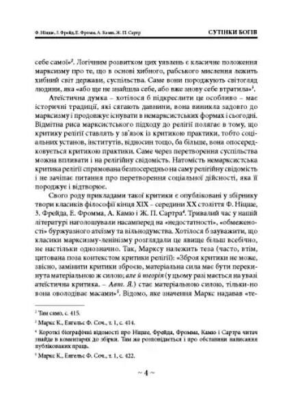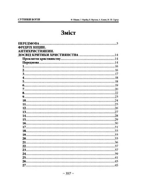 У збірнику «Сутінки богів» представлено вибрані праці видатних мислителів ХХ століття — Фрідріха Ніцше, Зиґмунда Фрейда, Еріха Фромма, Альбера Камю та Жана-Поля Сартра. Тексти порушують фундаментальні проблеми філософії та культури, зокрема питання сенсу життя, свободи й відповідальності людини, кризи традиційних цінностей, ролі моралі, релігії та підсвідомого у формуванні людської особистості. Видання дозволяє простежити розвиток екзистенціалізму, психоаналізу та філософії життя, а також їхній вплив на сучасне гуманітарне мислення. Збірник адресовано студентам, викладачам і всім, хто цікавиться філософією та історією ідей.