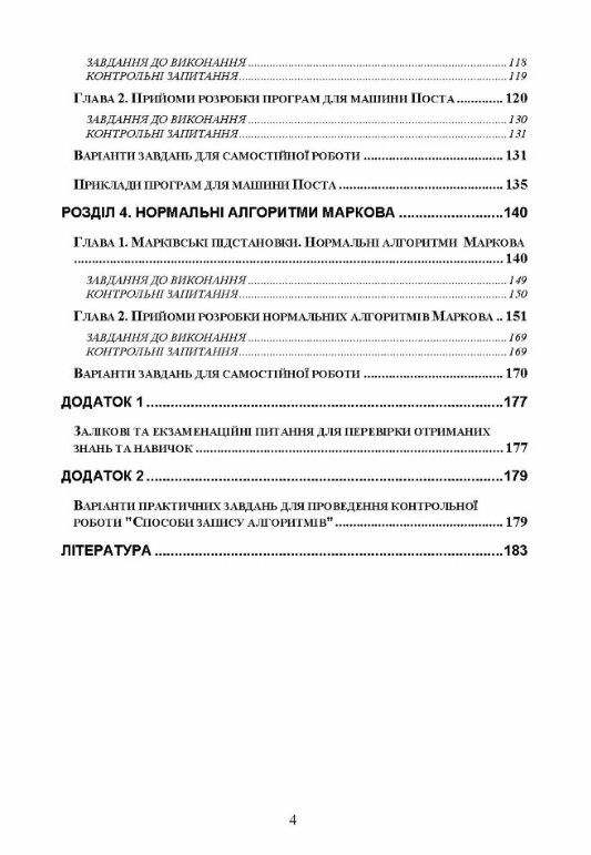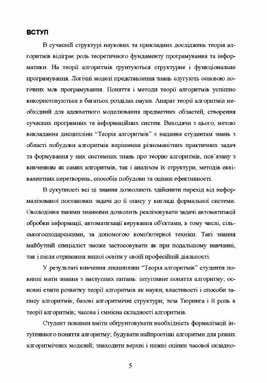 Посібник призначається для знайомства студентів з формальними підходами до визначення поняття "алгоритм", його властивостями, способами запису та підходами до їх розробки. В посібнику також детально розглянуті найвідоміші формалізації поняття алгоритма (машини Тюринга, машини Поста та нормальні алгоритми Маркова), велику увагу приділено методам та технологіям їх розробки. Для закріплення отриманих знань та набуття необхідних практичних навичок студентам пропонуються завдання для самостійної роботи, варіанти практичних завдань для проведення контрольної роботи, приклади питань для проведення контролю знань та довідкові матеріали, необхідні студентам під час виконання самостійних завдань. Посібник розрахований на студентів вищих навчальних закладів.