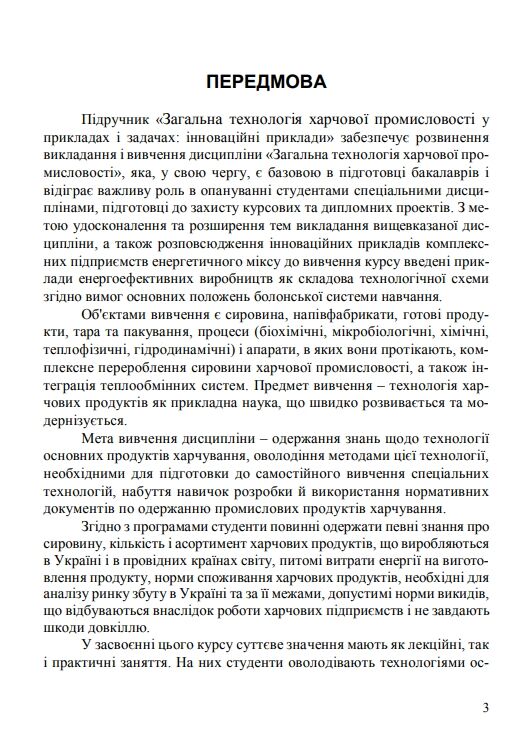 Викладено основи комплексних інноваційних заходів у загальній технології харчової промисловості за основними положеннями болонської системи навчання з урахуванням фізико-хімічних, біохімічних та технологічних закономірностей на прикладі ресурсо- та енергозбереження. Подані характеристики надають можливість ознайомлення зі складовими курсового та дипломного проектування. Приведені основні розрахункові формули для інноваційних заходів, норм витрат сировини і допоміжних матеріалів, зниження витрат і відходів при виробництві, а також формули, що необхідні для розв’язання прикладів, тестів і контрольних задач.