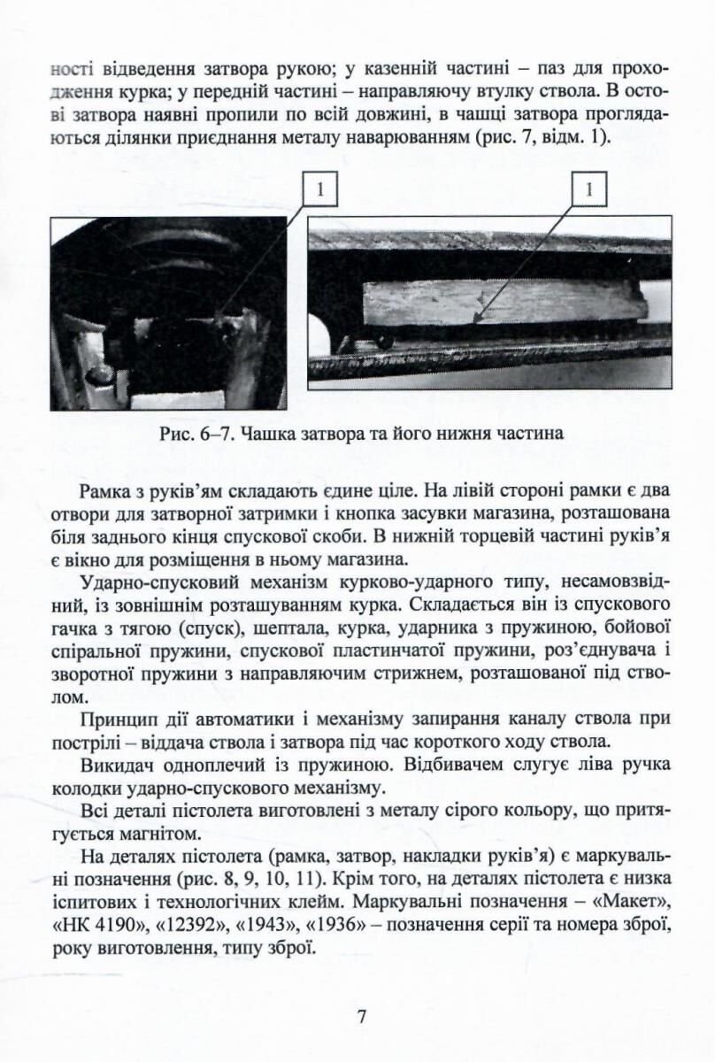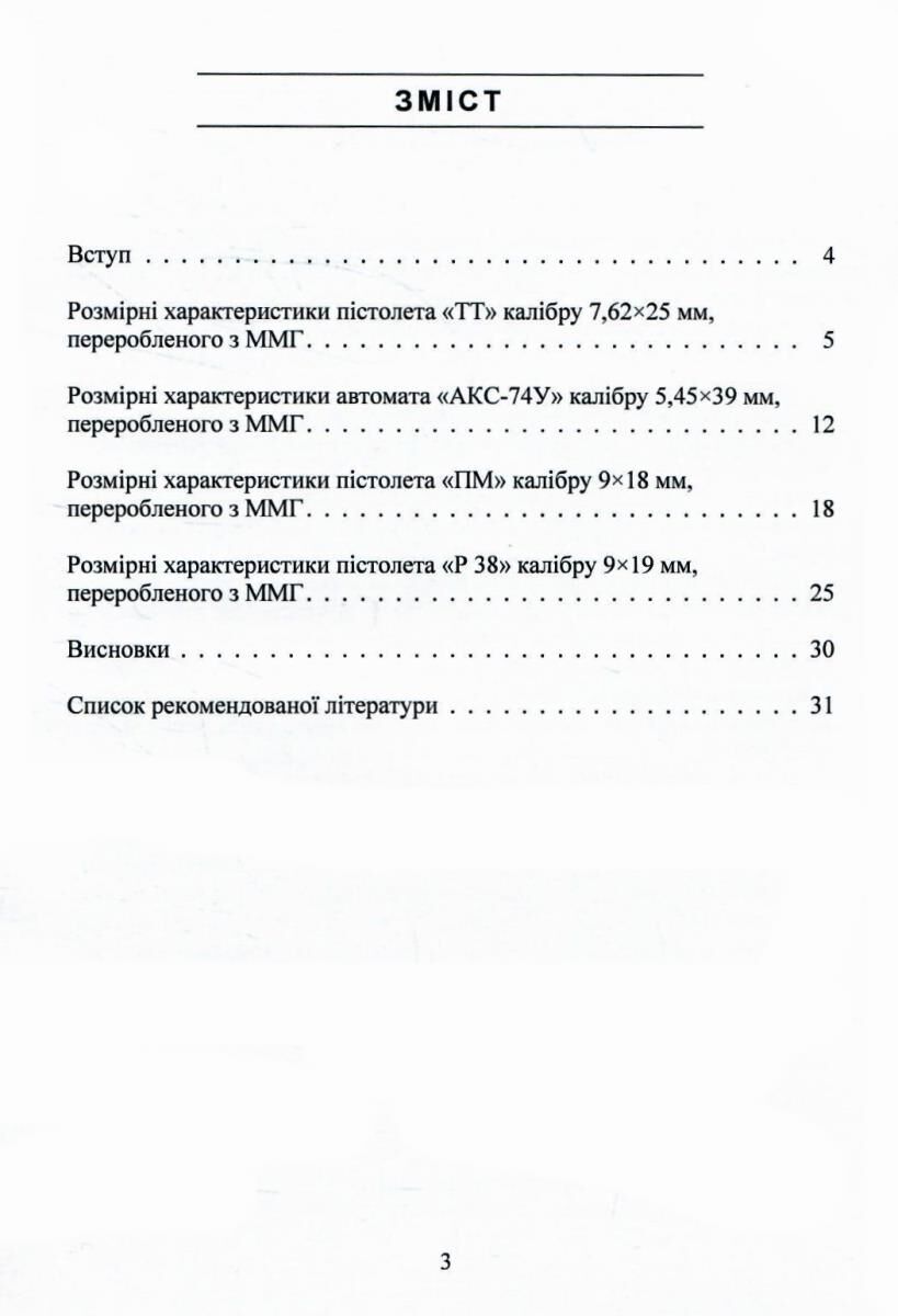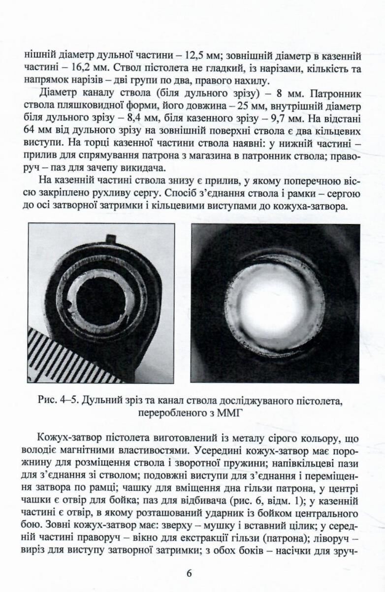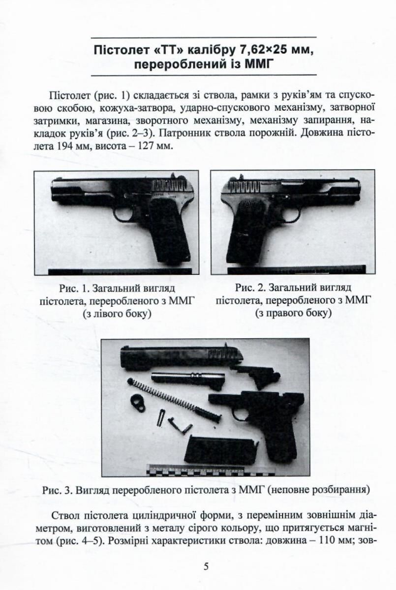 У посібнику розглянуто особливості переробки з ММГ пістолетів «ТТ» калібру 7,62×25 мм, «ПМ» калібру 9×18 мм, «Р 38» калібру 9×19 мм, а також автомата «АКС-74» калібру 5,45×39 мм та описано сліди від частин і механізмів зброї на кулях і гільзах.Автор: Мельник Н. В. – головний експерт відділу експертизи зброї та трасологічної експертизи лабораторії криміналістичної експертизи Державного науково-дослідного експертно-криміналістичного центру МВС України, кандидат юридичних наук.