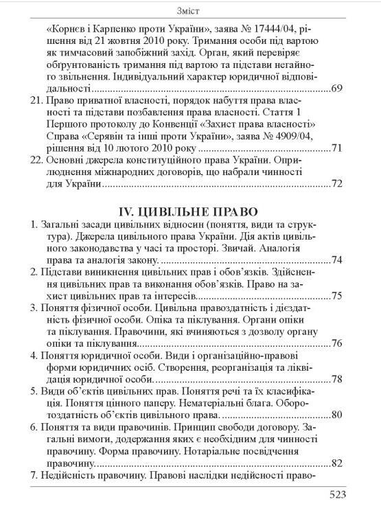 У навчально-практичному посібнику системно та комплексно висвітлюються відповіді на питання усної частини кваліфікаційного іспиту, який складається для набуття права на заняття адвокатською діяльністю в Україні. Посібник розроблено відповідно до чинної Програми складення кваліфікаційного іспиту, затвердженої рішенням Ради адвокатів України. Видання розраховане на осіб, які готуються до складання кваліфікаційного іспиту для отримання свідоцтва про право на заняття адвокатською діяльністю, науковців, викладачів, аспірантів (ад’юнктів), студентів та слухачів закладів вищої освіти правового спрямування та юридичних факультетів, а також адвокатів, практичних співробітників органів досудового розслідування, прокурорів, суддів та всіх, хто цікавиться правом. Передмова Відповідно до Конституції України, для надання професійної правничої допомоги в Україні діє адвокатура. Незалежність адвокатури гарантується. Засади організації і діяльності адвокатури та здійснення адвокатської діяльності в Україні визначаються законом. Адвокат здійснює представництво іншої особи в суді, а також захист від кримінального обвинувачення. Адвокатська діяльність здійснюється на принципах верховенства права, законності, незалежності, конфіденційності та уникнення конфлікту інтересів. У цьому навчально-практичному посібнику зібрано відповіді на питання усного іспиту, який складається для набуття права на заняття адвокатською діяльністю в Україні. Посібник розроблено відповідно до чинної Програми складення кваліфікаційного іспиту, затвердженої рішенням Ради адвокатів України. Відповіді є стислим викладенням положень законодавства, судової практики та розкривають зміст таких положень у зручній інформативній формі в тому обсязі, який є необхідним і достатнім для демонстрування належного рівня підготовки особи, яка має намір займатися адвокатською діяльністю. Матеріал підготовлено з перспективним урахуванням змін до Конституції України, норм матеріального та процесуального права, а також законодавства про судоустрій і статус суддів, затверджених парламентом. Водночас, у посібнику враховано аспекти перехідного періоду реформування судової системи, а також те, як остання функціонує станом на сьогодні. Автори поставили перед собою завдання максимально уніфікувати процес підготовки майбутніх адвокатів до кваліфікаційного іспиту. З огляду на це, зосередженість на змістовності та уникнення відсильних правових положень у відповідях стали тим здобутком, що відрізняє цей навчально-практичний посібник від інших подібних джерел. Максимум інформативності в мінімумі тексту є визначальним для найефективнішої підготовки до адвокатського іспиту, а також упевненості тих, хто до нього готуються, у власних предметних знаннях.