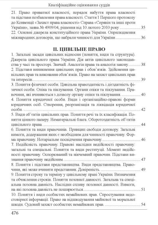 У посібнику в зручній інформативній формі системно та комплексно викладаються положення законодавства, судової практики, основні концептуальні позиції міжнародних експертів та інституцій щодо оцінювання підготовки судді або особи, яка претендує на посаду судді. Матеріал підготовлено з перспективним урахуванням змін до Конституції України та законодавства України про судоустрій і статус суддів, затверджених парламентом. Водночас, у посібнику враховано аспекти перехідного періоду реформування правової системи, а також те, як остання функціонує станом на сьогодні. Видання розраховане на суддів, кандидатів на посаду судді, наукових співробітників, слухачів закладів вищої освіти правового спрямування та юридичних факультетів, а також адвокатів, практичних співробітників органів досудового розслідування та всіх хто цікавиться правом.