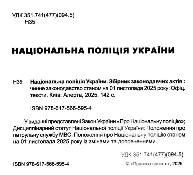 У запропонованому виданні подано Закон України «Про Національну поліцію»; Дисциплінарний статут Національної поліції на околицях; Положення про патрульну роботу МВС; Положення про Національну поліцію. У виданні подано Закон України «Про Національну поліцію»; Дисциплінарний статут Національної поліції України; Положення про патрульну службу МВС; Положення про Національну поліцію.