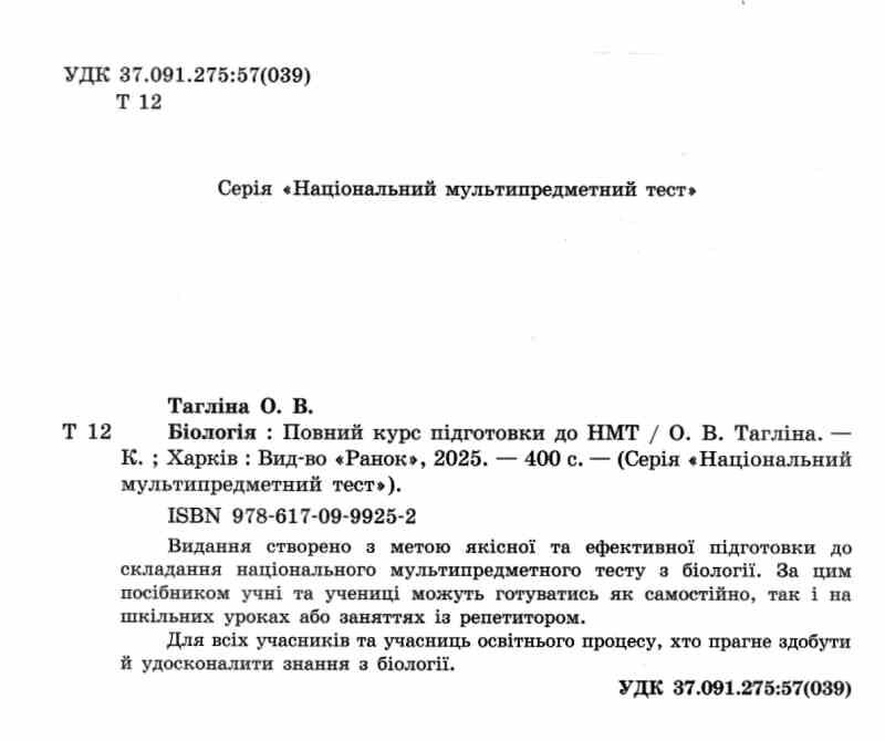 Видання створено з метою якісної та ефективної підготовки до складання НМТ з біології. У довіднику подається теоретичний матеріал, вправи, тести до кожної теми, а також тренувальні тести. За цим посібником учні та учениці можуть готуватись як самостійно, так і на шкільних уроках або заняттях із репетитором. Для всіх учасників та учасниць освітнього процесу, хто прагне здобути й удосконалити знання з біології.