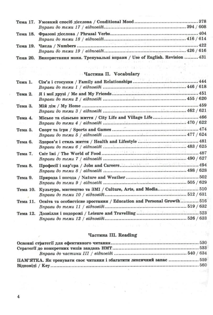 Мета посібника — допомогти учням у підготовці до успішного складання ЗНО/НМТ з англійської мови. Структурований і систематизований матеріал охоплює всі аспекти іспиту: граматику, лексику, використання мови, читання.