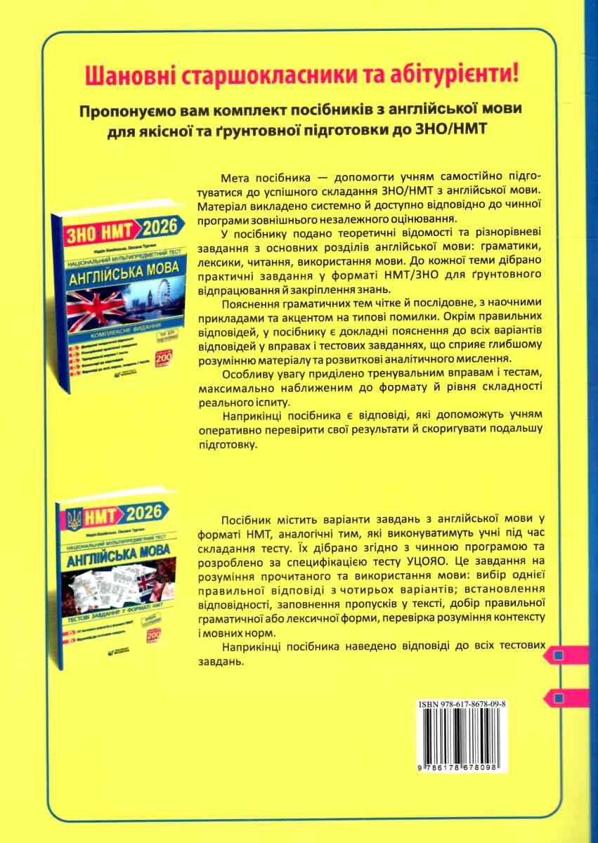 Мета посібника - допомогти учням у підготовці до успішного складання НМТ. Збірник містить 12 варіантів по 32 тестові завдання, розроблені за специфікацією тесту УЦОЯО з англійської мови. Зміст, структура та формат завдань аналогічні тим, що їх пропонують на НМТ. До всіх завдань у посібнику подано відповіді.